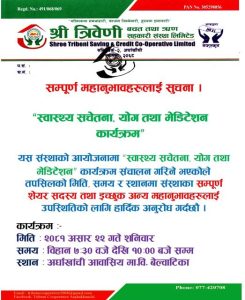 त्रिवेणी बचत तथा ऋण सहकारी संस्था लिमिटेड सन्धिखर्क २,को आयोजनामा स्वास्थ्य सचेतना, योग तथा मेडिटेशन कार्यक्रम सनिवार अर्घाखाँची आवासिय माबि बेलबाटीकामा सम्पन्न भएको छ । कार्यक्रमको उद्घाटन गर्दे सन्धिखर्क नगरप्रमुख कृष्णप्रसाद श्रेष्ठले आफ्नो स्वास्थ्यलाइ बलियो र मजबुद बनाउन खानपानमा विषेश ध्यान दिनुपर्ने बताउनुभयो । श्रेष्ठले आधुनिक जिवनशैली,आहारविहार र विग्रदो स्वास्थ्यलाइ सबल बनाउन योग ध्यान र मेडिटेशनमा लाग्न सबैलाइ आग्रहपनि गर्नुभयो ।