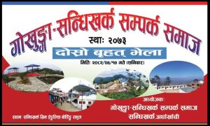 गोखुङ्गा–सन्धिखर्क सम्पर्क समाजको दोस्रो भेला सन्धिखर्कमा सम्पन्न भएको छ । सन्धिखर्क ग्रिन इङ्लिस बोर्डिङ्ग स्कुलको सभाहलमा सनिवार सम्पन्न भेलाले टिका माया शर्मा भुसालको अध्यक्षतामा १५ सदस्यीय गोखुङ्गा–सन्धिखर्क सम्पर्क समाजको गठन गरेको हो । जसको उपाध्यक्ष, सचिब,कोषाध्यक्ष र सह–सचिवमा क्रमशः तुल्सी पन्थी,बिशाल खनाल,कमल प्रसाद खनाल र रामप्रसाद पन्थी निर्वाचित रहनुभएको छ । यस्तै समितिको सदस्यहरुमा बोम बहादुर घ.म,गुणानिधि खनाल,माया खनाल,रिचा घिमिरे, ढकल पन्थी, रविन्द्र खनाल, प्रदिप परियार,सपना पन्थी,जानका खनाल र शारदा पन्थी रहनुभएको छ ।